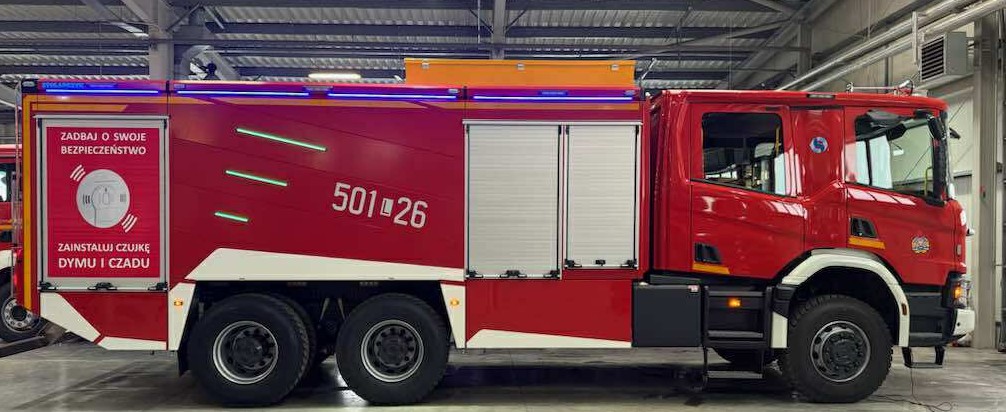 - Ciężki samochód ratowniczo-gaśniczy z funkcją dostarczania wody do celów bytowych z wyposażeniem na podwoziu Scania P450,